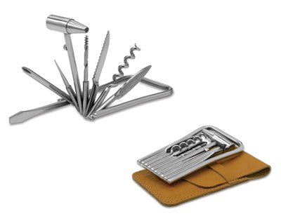 This handy tool features eight functionally generic tools that independently rotate out and snap open. Included is a Phillips-head screwdriver, slotted-head screwdriver, saw, corkscrew, file, punch/awl, gimlet, and small/large-head hammer that doubles as a bottle opener. Tools fold flat and fits in a leather case to carry in a pocket or on a belt loop.