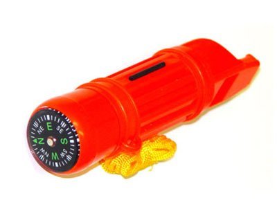 Survival whistle with a water tight compartment . It also has a compass, neck strap, and flint to start a fire. Perfect emergency camping tool.