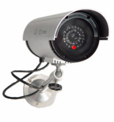 Now you can deter robbery, theft, and vandalism without the high cost of a real outdoor security camera. When placed outside your home or business, even the most sophisticated criminals will think the premises is guarded by a high-tech surveillance system and go in search of an easier target. In fact, this is an actual surveillance camera in outdoor housing that has been modified into a "dummy" or fake security camera. It features a flashing LED light on the front so you can be sure that the camera will be seen at night. Great security for parking lots or near the front door of a home, store, or business. Features authentic video cable, weather proof aluminum housing, and fully adjustable metal mounting bracket. Installs quickly and easily using the included stainless steel screws. Measures 10 3/4" long (rain shield extends 2 more inches) x 4" round (excluding mounting bracket). Operates on 2 "AA" batteries (not included). For additional security see item 52387 GE Security Yard Sign w/ Stake and Window Stickers.
