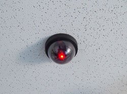 Now you can deter robbery, theft, and vandalism without the high cost of a real security camera. When placed in your home or business, even the most sophisticated criminals will think the premises is guarded by a high-tech surveillance system and go in search of an easier target. In fact, this is an actual dome surveillance camera that has been modified into a "dummy" or fake security camera. This dome dummy camera is designed to imitate the small, high tech security cameras on the market today. This unit contains a flashing red LED light which draws extra attention to the camera, particularly at night. Another feature of this camera is that the flashing light can be turn off or on by simply pressing the dome. With most of our models to stop the light flashing you would need to remove the batteries. Installs quickly and easily to the ceiling or wall using the included screws. The base measures 4 1/2" across and the dome is 2 3/4" high. Requires 2 "AA" batteries (not included).