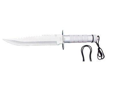 14" overall, includes survival kit, and leather sheath. Made in Taiwan