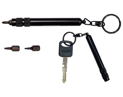 The TorxTool comes with 3 bits, T6 torx , T8 torx, and Phillips head screwdriver, which all store conveniently in the handle. The tip is magnetized to keep the bits in and hold onto screws when removed. Plus, all of this stores right on your keychain, so it is there in a pinch!