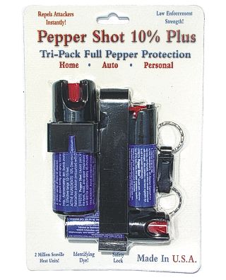 Pepper Shot™ is a 10% pepper spray rated at 2 million scoville heat units and made with a very fine grain that is more effective than the coarser grains of most other pepper sprays. Pepper Shot pepper spray is an inflammatory agent. In addition to causing an attacker pain, Pepper Shot induces coughing, choking, and nausea, swells the mucous membranes, which makes breathing difficult, and dilates the eye capilaries, causing the eyes to close. These effects last up to 45 minutes and cause no permanent damage. All sprays have locking actuators for extra safety. All Pepper Shot brand pepper sprays have an identifying dye. You will get approximately 6-10 one second bursts. The effective range is 6-8 feet for the 1/2 ounce sprays and 10-15 feet for the 2 ounce spray. This value pack would be priced at $30.85 if you purchased each item separately. Take advantage of this great deal at over 30% off!