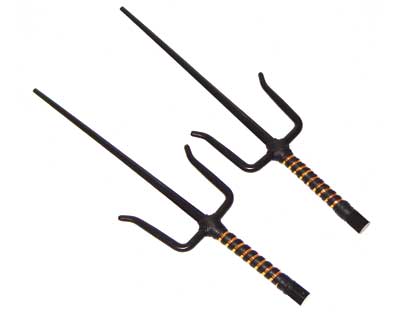 All metal black Ninja Sai. Each Sai has a black leather wrapped handle with gold color trim.