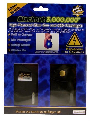Stun guns are an excellent method of self defense. First, they can serve as a deterrent. Just test firing this unit into the air is often enough to stop an attack or aggressive activity. As the bright electric current pulsates between the test prongs it creates an intimidating electrical sight and sound. An attacker with any sense at all will stop in his tracks. If the sight and sound doesn't stop him a jolt from this unit certainly will! Simply touching him with the device will deliver a high voltage shock causing loss of balance and muscle control, confusion, and disorientation- bringing him to his knees and making him incapable of further aggressive activity. Full recovery takes about five to ten minutes. There is no permanent harm. The Blackout 3,000,000* is small enough to fit inside a pack of cigarettes yet powerful enough to immobilize an attacker. Its rubberized shell makes it easy to handle and grip. The unit is rechargeable (rechargeable batteries are included) with a built-in plug for easy charging. There are no cords to keep up with; simply plug into a standard wall outlet. It also has a built-in bright LED flashlight for a convenient source of light. The unit comes with a safety switch to prevent accidental discharge and an optional disable pin to prevent the stun gun from being used on the victim in case the attacker takes the device. A stylish, durable holster is included for easy carrying. The SF3000RB comes with a lifetime limited warranty.