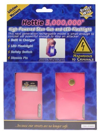 The Hottie 3,000,000* is small enough to fit inside a pack of cigarettes yet powerful enough to immobilize an attacker. Its rubberized shell makes it easy to handle and grip. The unit is rechargeable (rechargeable batteries are included) with a built-in plug for easy charging. There are no cords to keep up with; simply plug into a standard wall outlet. It also has a built-in bright LED flashlight for a convenient source of light. The unit comes with a safety switch to prevent accidental discharge and an optional disable pin to prevent the stun gun from being used on the victim in case the attacker takes the device. A stylish, durable holster is included for easy carrying. The SF3000RH comes with a lifetime limited warranty.