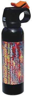 Approximately 38 one second bursts Effective range up to 20 feet. Wildfire 18% pepper spray is hot, hot, hot! 18% pepper spray and 3 million scoville heat units. Has one of the purest grade oleoresin capsicum formulas in a defensive spray. Wildfire comes in 5 sizes: 1/2 ounce, 1.5 ounce, 4 ounce, 9 ounce, and 1 pound. The two smaller pepper sprays come with an injection molded key-chain holster with belt-clip and safety lock. All have safety devices to prevent accidental discharge. All Wildfire OC pepper sprays have a non toxic vegetable dye to aid in assailant identification.